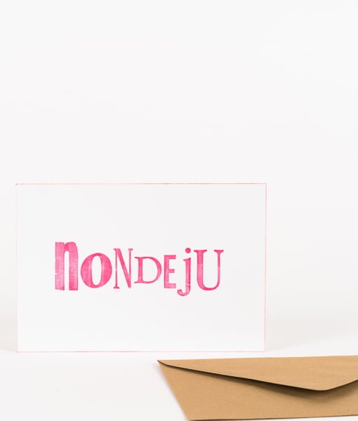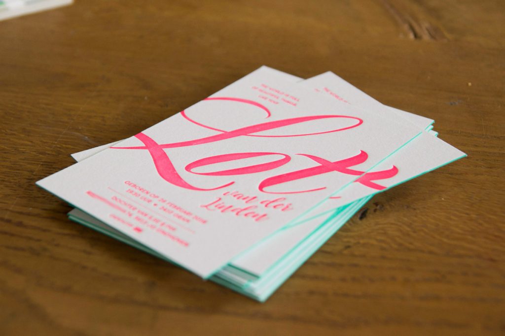 De kaartjes zijn gedrukt op mooi dik 600 grams papier. Door de pers zwaar af te stellen zijn de letters en lekker ingedrukt. Een fluor roze kleur, de fluor kleur op snede en het karakter van de houten letters doen de rest! Juist door het karakter van deze letters en het handmatig beïnkten is geen