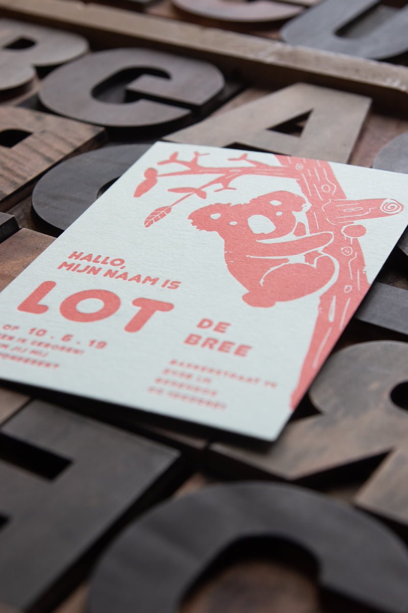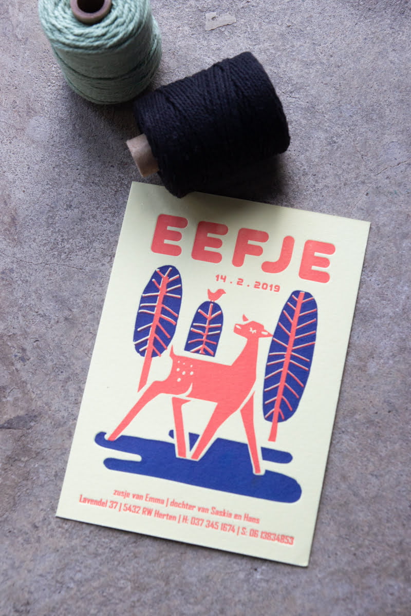 Voordat de serie uitgewerkt werd, werd er uitgebreid onderzoek gedaan. Papiersamples werden besteld, er werden tekening gemaakt (digitaal en met pen), linoleum werd gesneden en kleuren werden getest. Dit alles om op zoek te gaan naar de mogelijkheden en onmogelijkheden van letterpress en stempels. Einddoel…een gave serie originele geboortekaartjes in trendy kleurencombinaties. Geslaagd? Beoordeel zelf zou ik zeggen!
