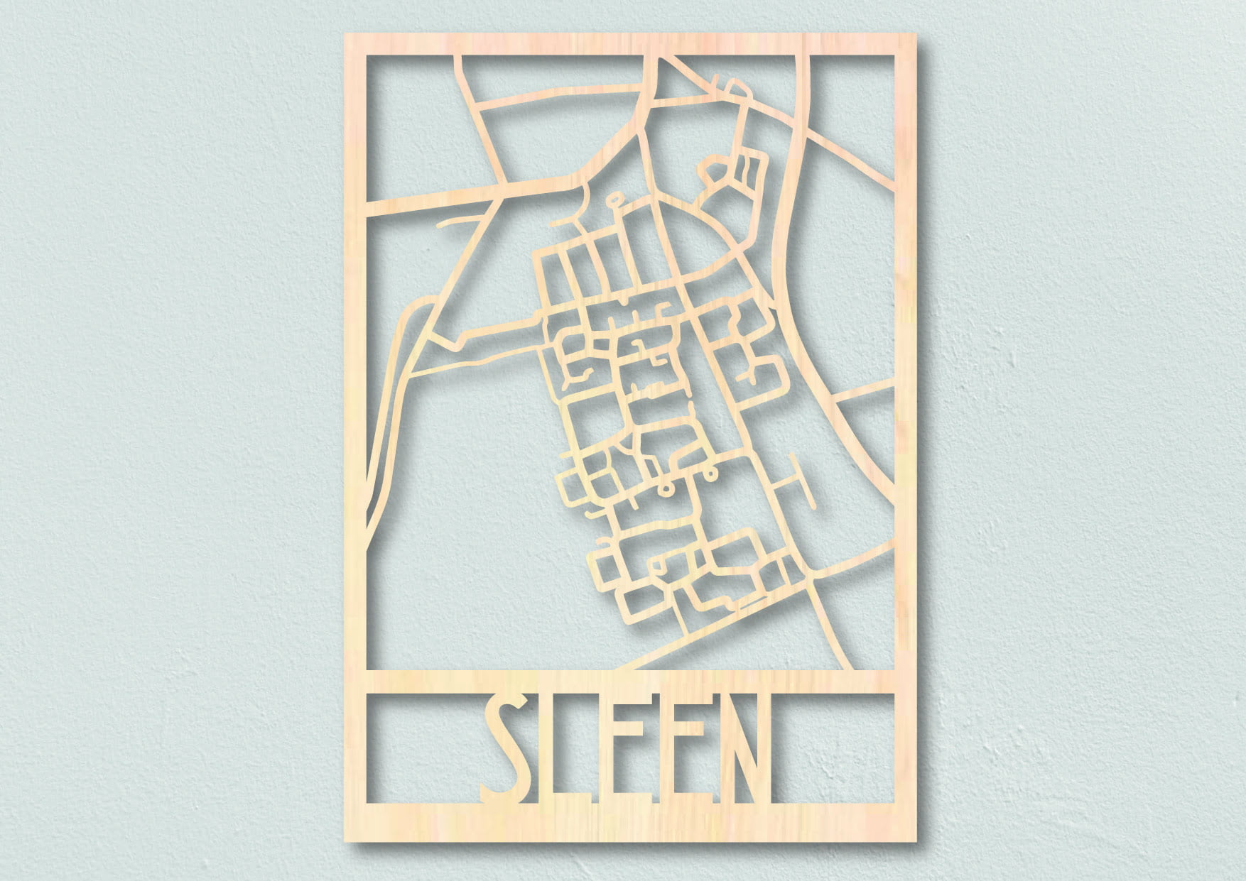 Laat een houten stadskaart maken van jouw dorp of stad. De dorps- en stadsplattegronden uit 4mm multiplex hout worden gemaakt in samenwerking met meubelwinkel de Frisfabriek in Panningen. Optioneel kan de houten plattegrond ook zwart worden gebeitst.