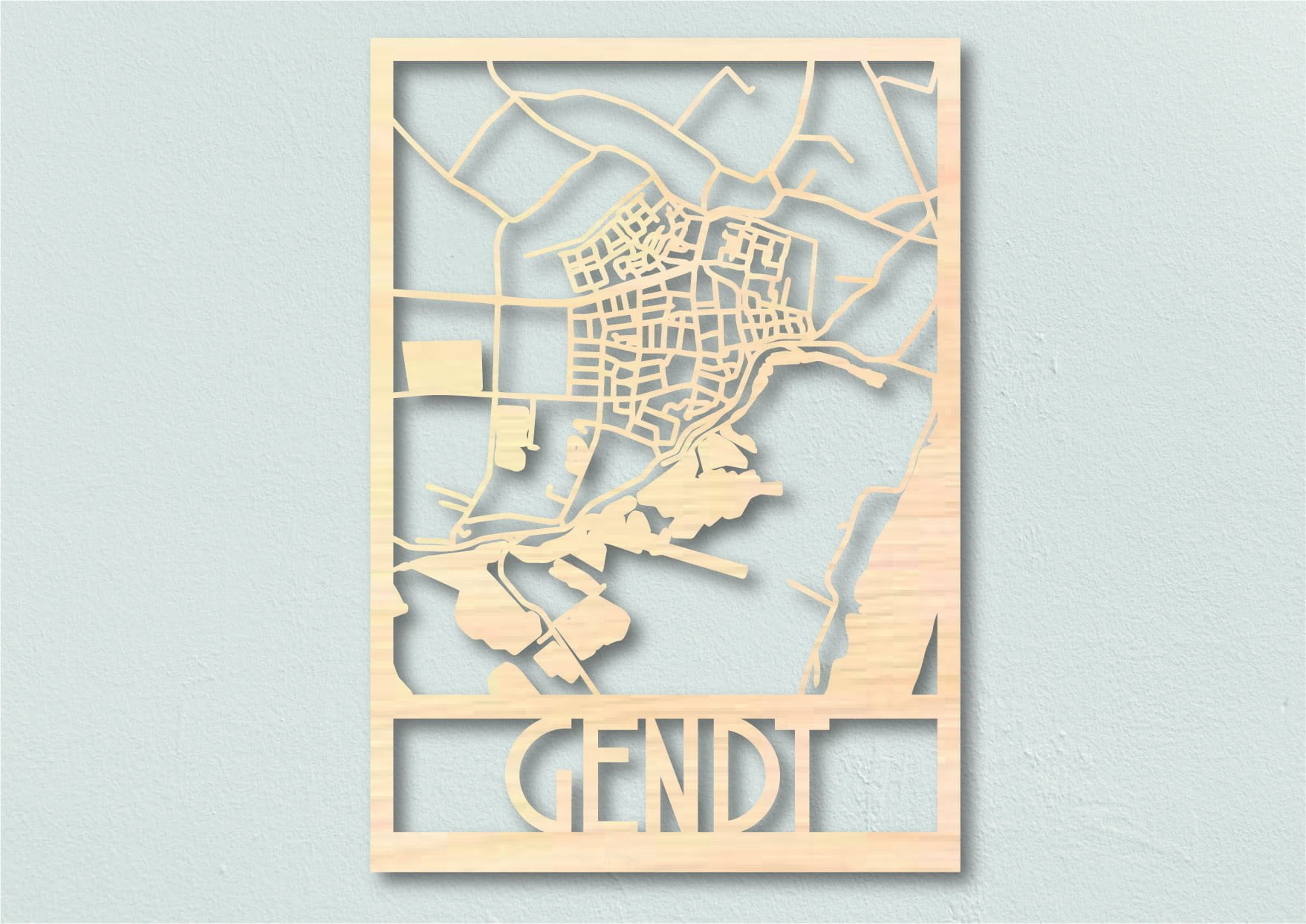 Laat een houten stadskaart maken van jouw dorp of stad. De dorps- en stadsplattegronden uit 4mm multiplex hout worden gemaakt in samenwerking met meubelwinkel de Frisfabriek in Panningen. Optioneel kan de houten plattegrond ook zwart worden gebeitst.