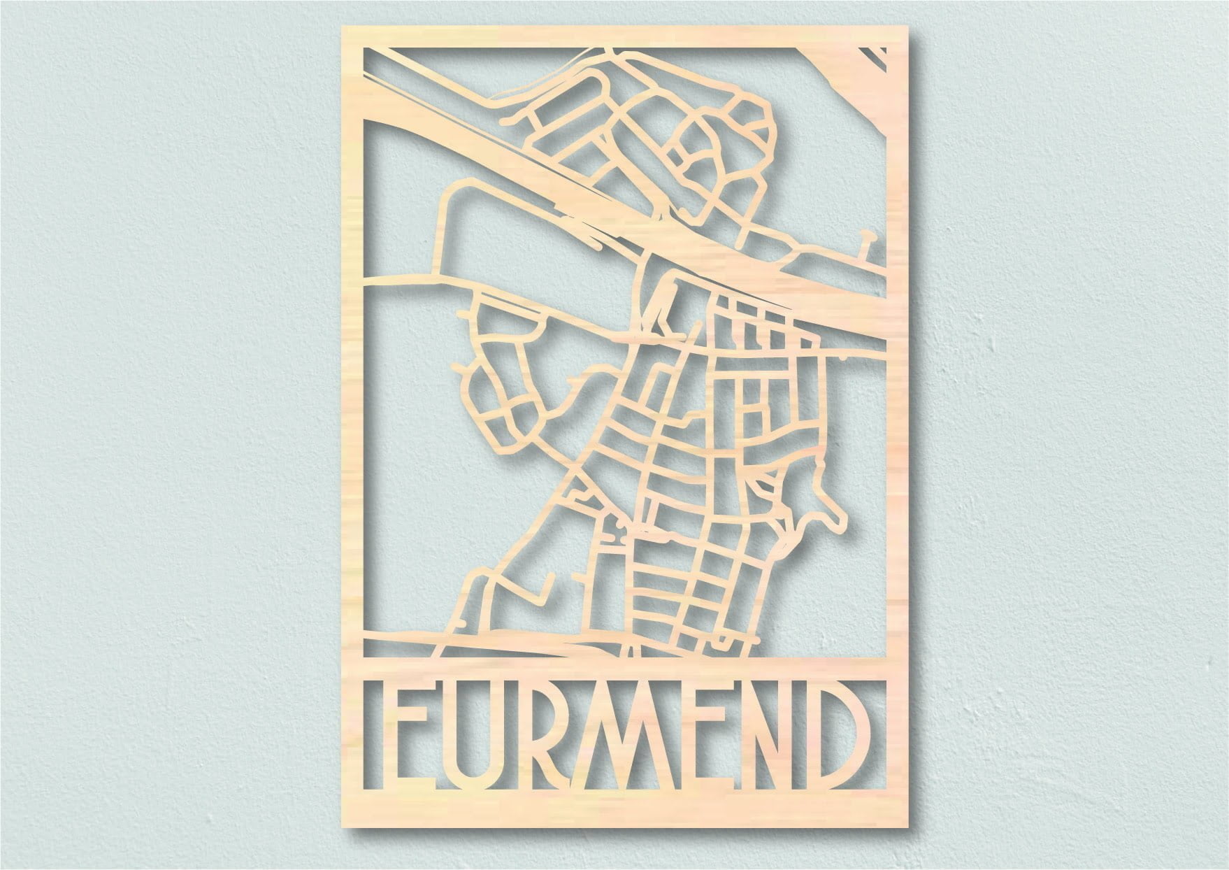 Laat een houten stadskaart maken van jouw dorp of stad. De dorps- en stadsplattegronden uit 4mm multiplex hout worden gemaakt in samenwerking met meubelwinkel de Frisfabriek in Panningen. Optioneel kan de houten plattegrond ook zwart worden gebeitst.