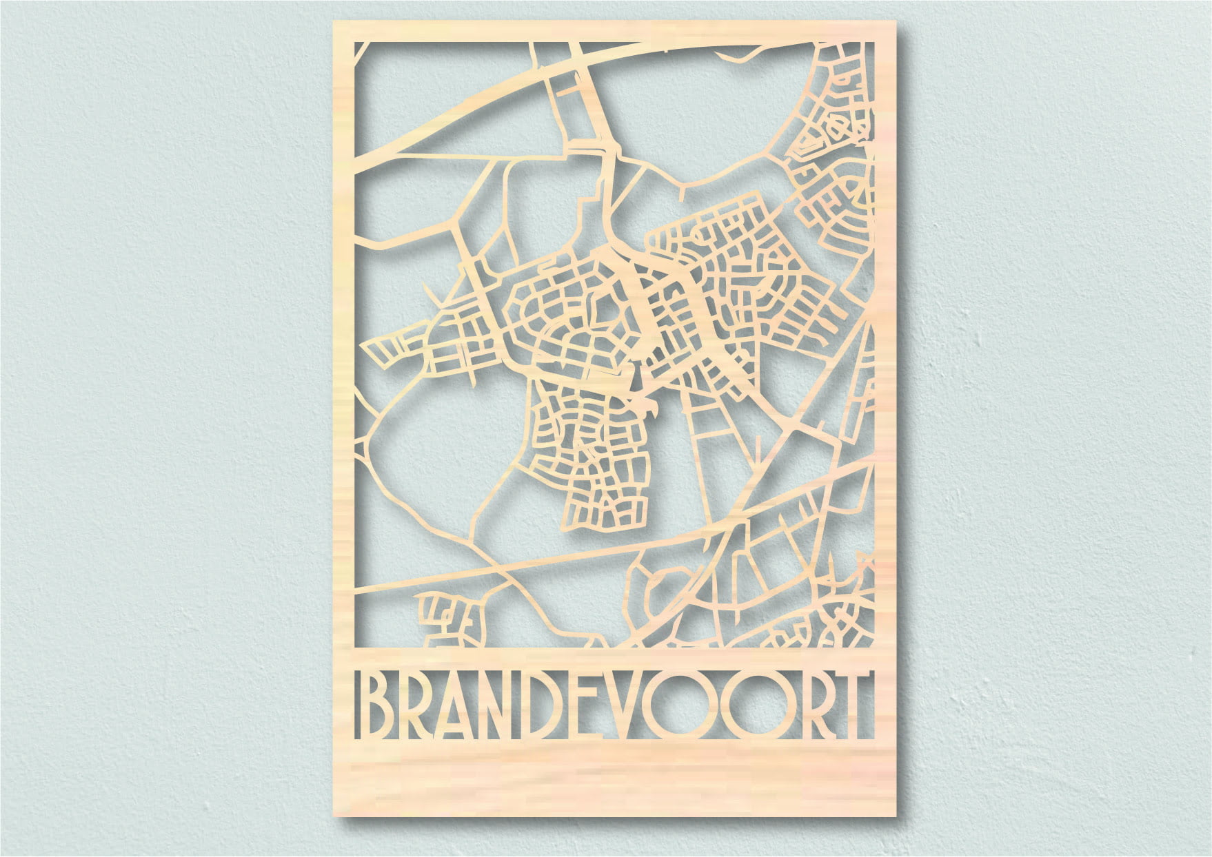 Laat een houten stadskaart maken van jouw dorp of stad. De dorps- en stadsplattegronden uit 4mm multiplex hout worden gemaakt in samenwerking met meubelwinkel de Frisfabriek in Panningen. Optioneel kan de houten plattegrond ook zwart worden gebeitst.