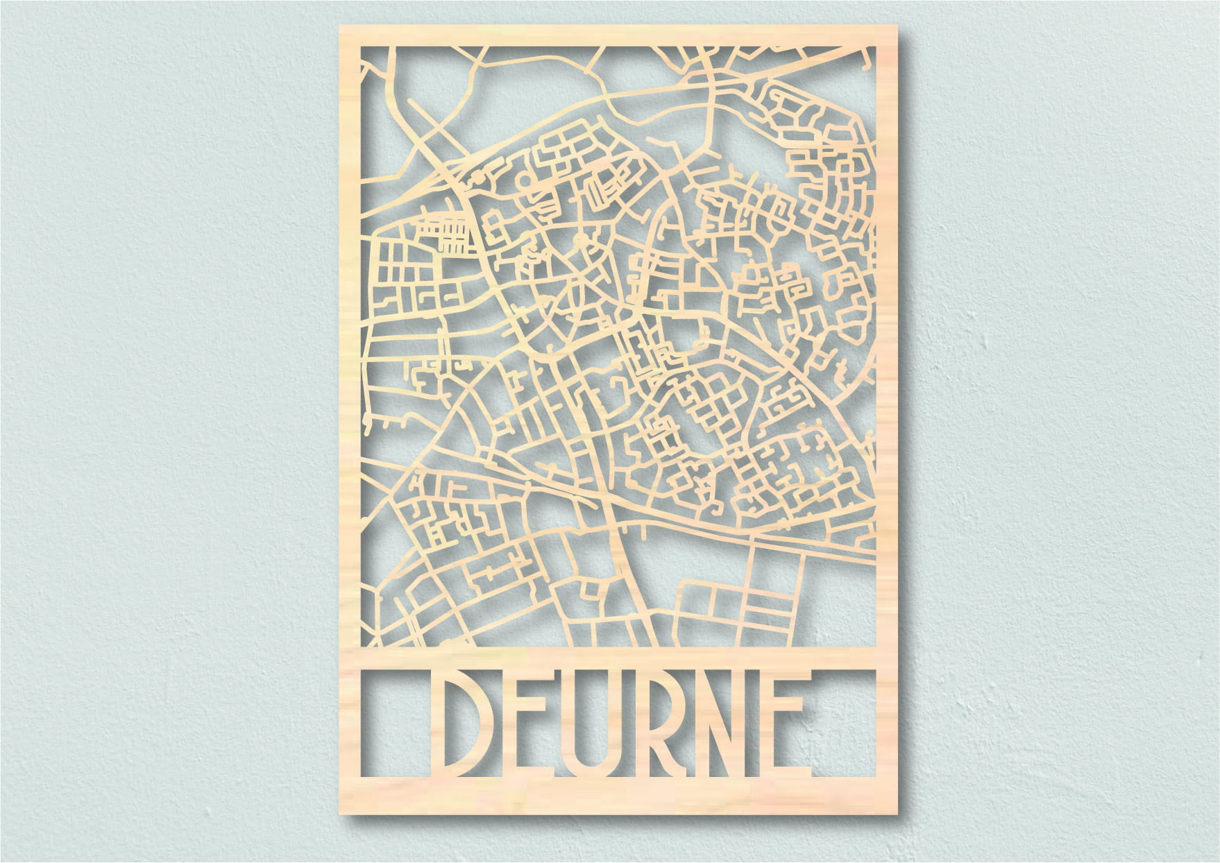 Laat een houten stadskaart maken van jouw dorp of stad. De dorps- en stadsplattegronden uit 4mm multiplex hout worden gemaakt in samenwerking met meubelwinkel de Frisfabriek in Panningen. Optioneel kan de houten plattegrond ook zwart worden gebeitst.