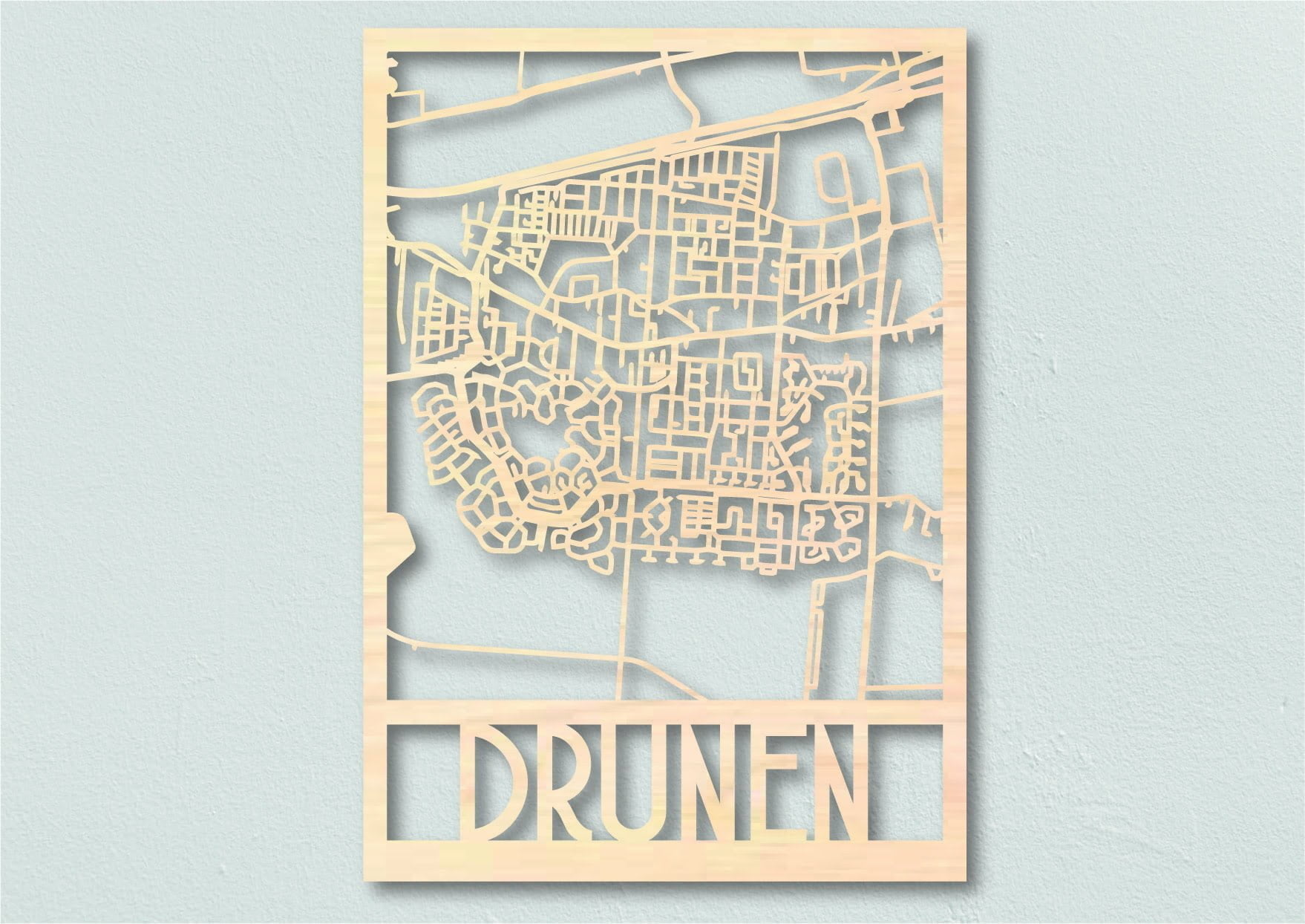 Laat een houten stadskaart maken van jouw dorp of stad. De dorps- en stadsplattegronden uit 4mm multiplex hout worden gemaakt in samenwerking met meubelwinkel de Frisfabriek in Panningen. Optioneel kan de houten plattegrond ook zwart worden gebeitst.