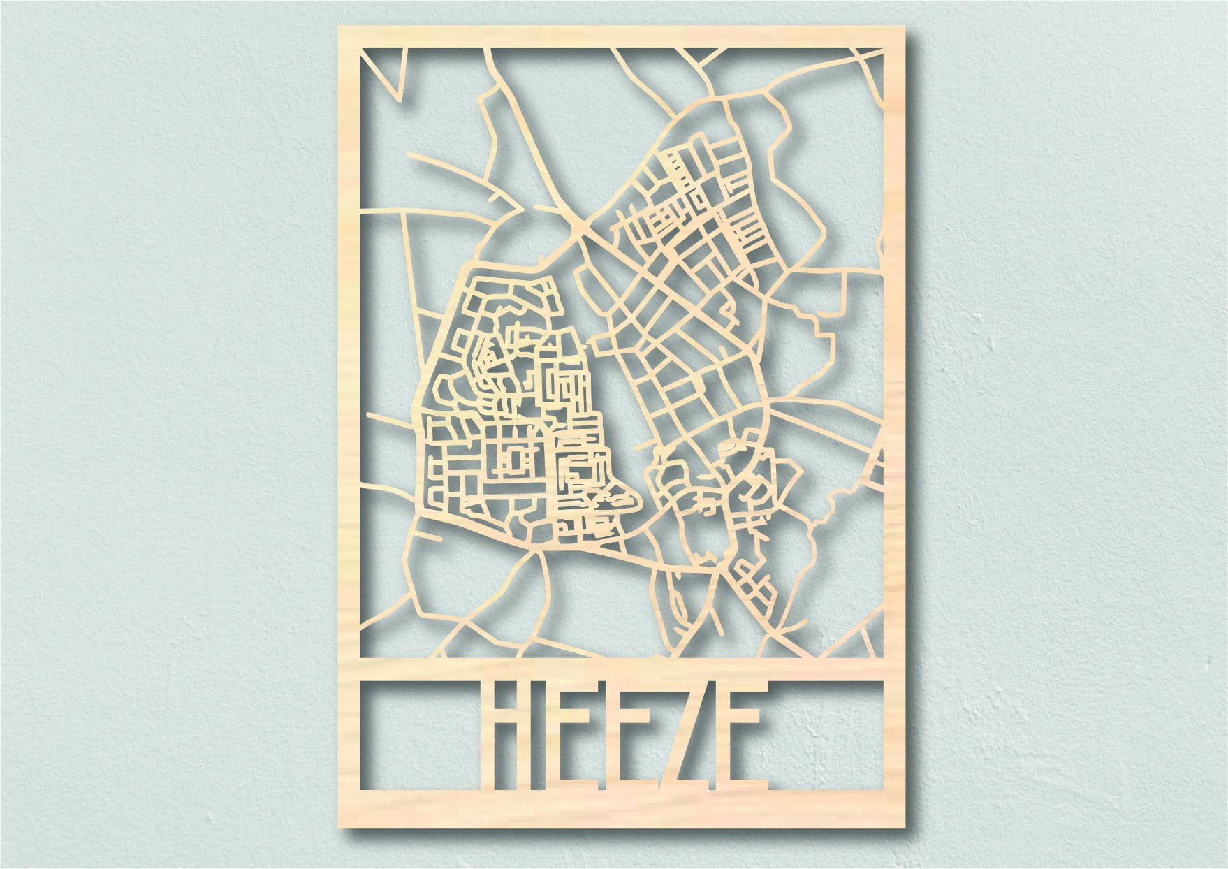 Laat een houten stadskaart maken van jouw dorp of stad. De dorps- en stadsplattegronden uit 4mm multiplex hout worden gemaakt in samenwerking met meubelwinkel de Frisfabriek in Panningen. Optioneel kan de houten plattegrond ook zwart worden gebeitst.