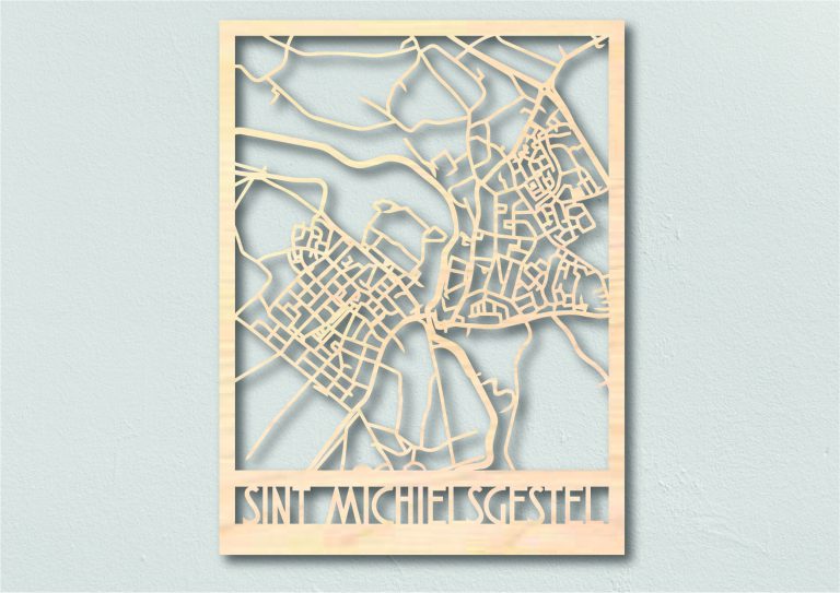 Laat een houten stadskaart maken van jouw dorp of stad. De dorps- en stadsplattegronden uit 4mm multiplex hout worden gemaakt in samenwerking met meubelwinkel de Frisfabriek in Panningen. Optioneel kan de houten plattegrond ook zwart worden gebeitst.