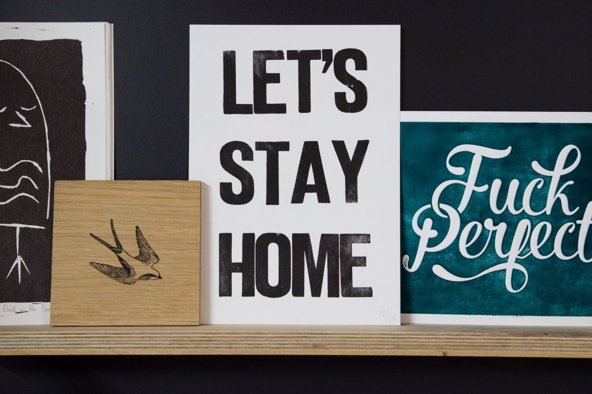 Laten we vanavond thuisblijven! 100 jaar oude letters, katoenpapier en het karakter van het handmatig beïnkten van de letters. Een stoere print met een authentieke uitstraling. Geen fancy effecten, maar het pure en unieke karakter van letterpress. Deze print is gedrukt op 100% katoenpapier (300 grams)